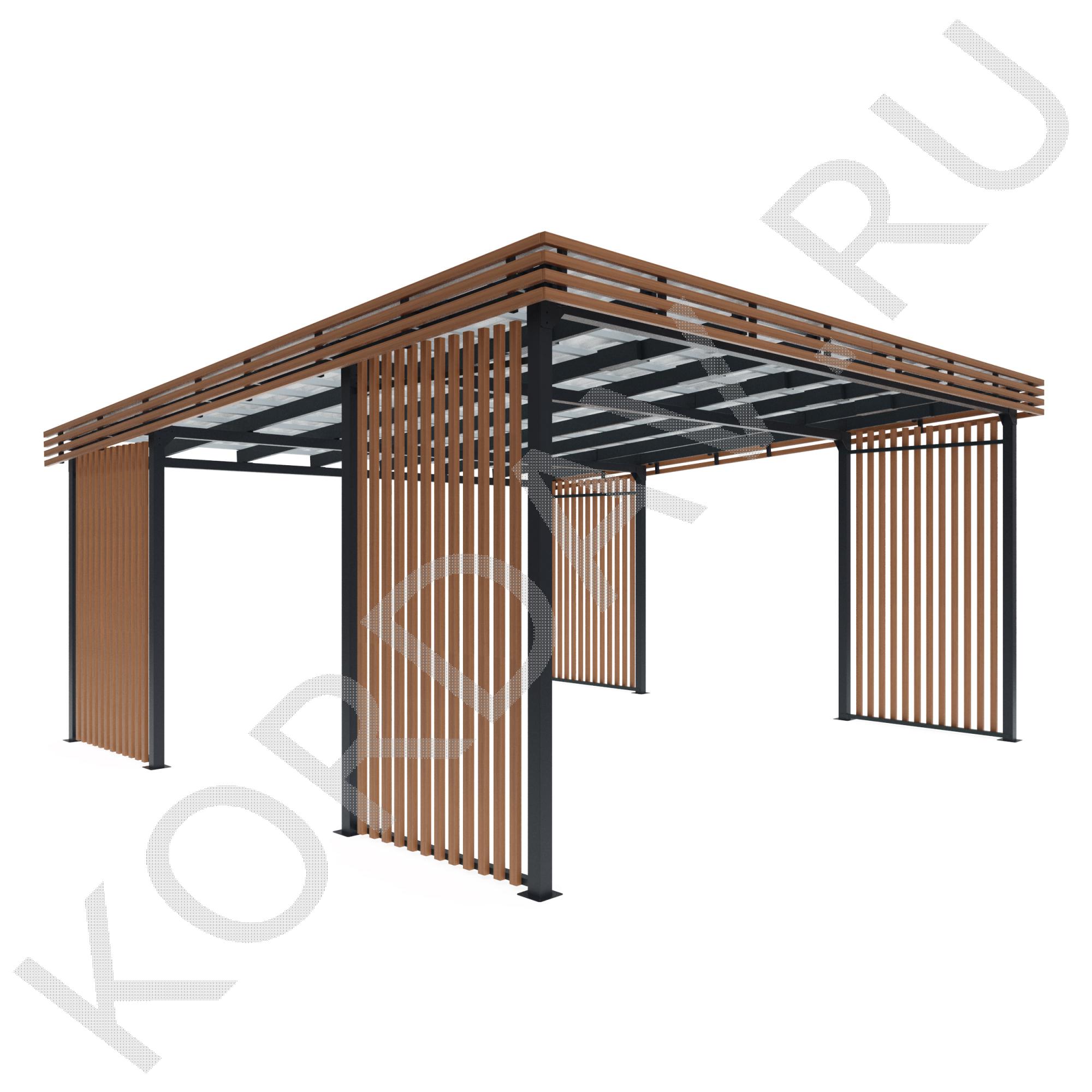 Боковые стены навеса выполнены из деревянного профиля с акцентом на эстетику и защиту от ветра и осадков.